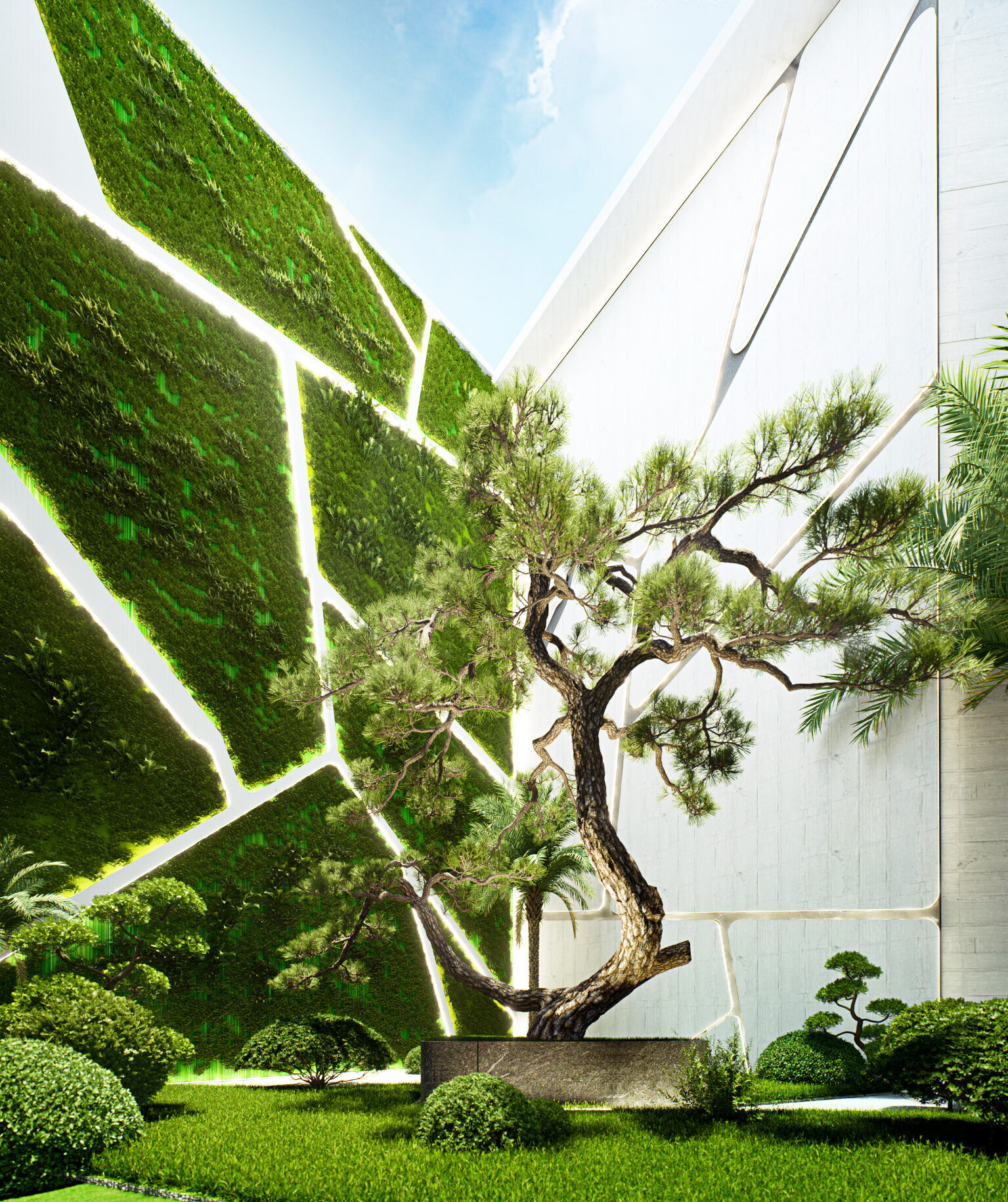 สิ่งที่น่าสังเกตเป็นพิเศษคือความเขียวขจีที่ปกคลุมผนังด้านหนึ่งของห้องโถงใหญ่ สวนแนวตั้งแห่งนี้ได้รับการออกแบบโดยใช้รูปทรงเรขาคณิต ทำให้พื้นที่ดูมีสไตล์และทันสมัย สะท้อนถึงสถาปัตยกรรมอันเป็นเอกลักษณ์ของคอมเพล็กซ์ ผนังห้องนั่งเล่นไม่เพียงตกแต่งห้องโถงเท่านั้น แต่ยังช่วยสร้างปากน้ำที่สะดวกสบายยิ่งขึ้น ทำให้อากาศอิ่มตัวด้วยความสดชื่นตามธรรมชาติ